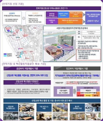 먼저 서울시는 G밸리 국가산업단지계획에서 기업 간 교류와 연구개발 등 지원시설을 확충하기 위해 13개 전략거점을 선정하고 특별계획 구역으로 지정했다. 또 지원거점 개발 시 공공부지는 연면적 30% 이상을 R&D 센터, 창업지원시설 등의 '산업교류 혁신지원 공간'을 의무 도입하도록 하였다.