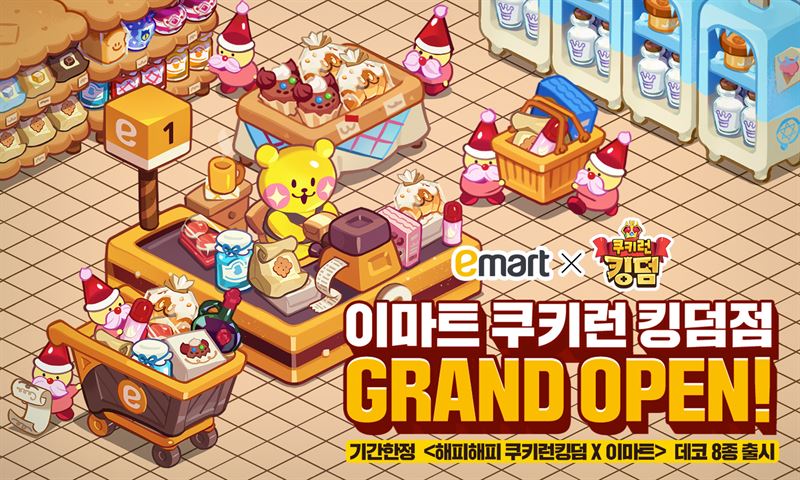 이마트 쿠키런 킹덤점 그랜드 오픈은 쿠키 왕국에 이마트가 개점하는 컨셉으로 이마트 꾸미기 테마를 앞세운 다양한 인게임 아이템과 유저 이벤트를 선보이는 콜라보레이션이다.