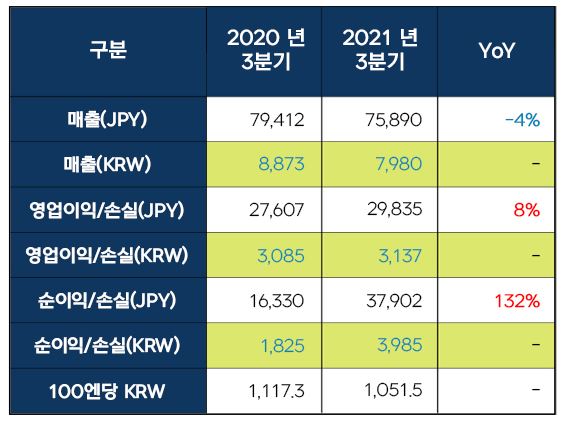 매출은 약 759억엔(약 7980억원)으로 전년 동기 대비 4% 감소했다. 영업이익은 약 298억엔(약 3137억원)으로 전년 동기 대비 8% 증가했다. 순이익은 약 380억엔(3985억원)으로 전년 동기 대비 132% 늘었다.