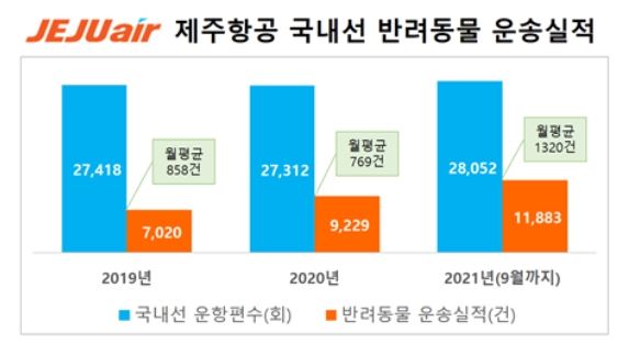 제주항공은 올들어 지난 9월말까지 1만1883건의 반려동물 운송 실적을 기록해 2019년에 7020건과 2020년의 9229건을 넘어섰다. 월별 평균 운송 실적은 2019년 585건에서 올해 1320건으로 2.3배 늘었다.