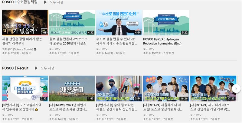 포스코TV 콘텐츠는 ▲Shorts ▲PR Movies ▲만남이 예술이 되다 ▲People ▲INNOVILT(이노빌트) ▲기업시민 ▲Culture ▲Recruit ▲수소환원제철로 구성돼 있다. 기업 홍보 영상이나 이벤트부터 자사 채용공고와 제품 브랜드, 사람과 문화이야기까지 다양하다. 구독자들은 포스코가 어떤 제품을 만들고 어떤 연구를 하고 있는 기업인지 짧은 영상 안에 담아내 보기가 쉽고 알차다는 평이다.