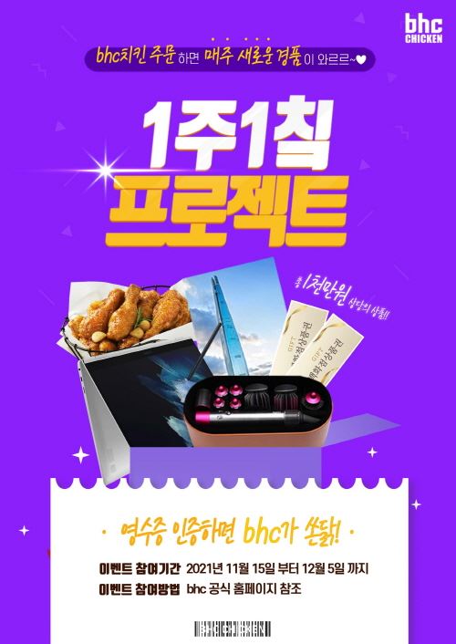 이번 프로모션은 bhc치킨 메뉴를 주문하고 구매 인증을 해 주신 고객분들 중 추첨을 통해 매주 푸짐한 경품을 제공하는 이벤트로 경품 규모는 총 1,000만 원 상당이다.
