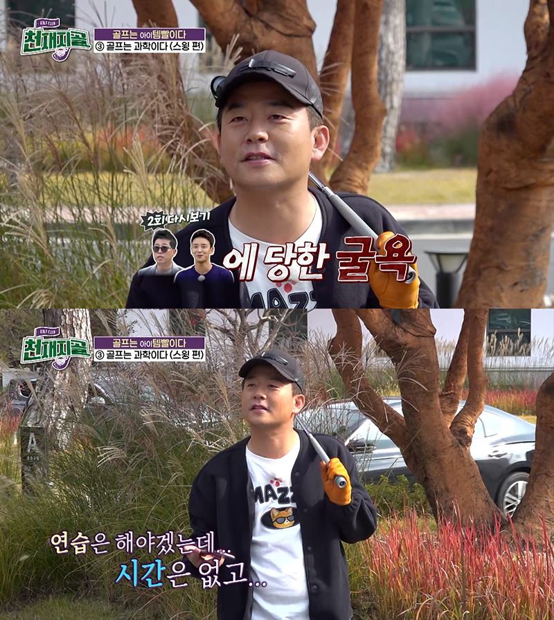 MBC Every1의 새 골프 예능 ‘천재지골’ 3회에서는 MC 김준호가 지난회에서 당한 연폐 굴욕을 만회하기 위해 바쁜 스케줄 속 틈틈이 스윙 연습하는 장면이 공개됐다.