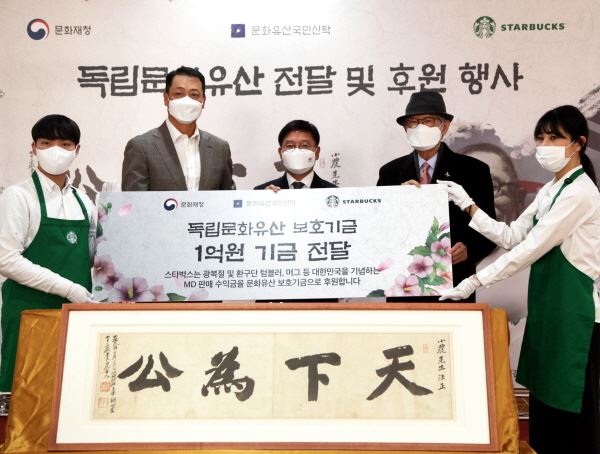 아울러, 스타벅스는 지난 2009년 문화재청과 문화재 지킴이 협약을 맺고 덕수궁 환경정화 봉사활동, 주미대한제국공사관 보존 후원 및 홍보, 광복절 MD 제작 등 문화유산 보호를 위한 다양한 활동을 지속하고 있다. 최근에는 백범 김구 선생의 친필 휘호 유물인 “존심양성(存心養性)”, ”광복조국(光復祖國)”, “천하위공 (天下爲公)”과 도산 안창호 선생의 친필 휘호 유물인 “약욕개조사회 선자개조아궁(若欲改造社會 先自改造我窮)” 등을 기증하며 독립문화유산 기증 및 보호에도 앞장서고 있다.