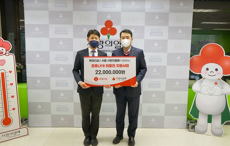 롯데건설(대표이사 하석주)은 지난 15일 코로나19 전담 의료진을 돕기 위해 사랑의 열매 사회복지공동모금회에 물품을 지원하고 이를 기념하기 위해 서울 중구 사랑의열매회관에서 기증판 전달식을 가졌다고 밝혔다.