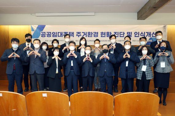 김헌동 서울주택도시(SH)공사 사장(앞줄 왼쪽 다섯 번째) 등 참가자들이 16일 ‘살고 싶은 공공주택’ 세미나에서 기념촬영을 하고 있다(사진=SH공사)