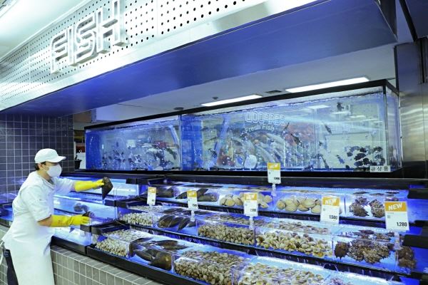 수산매장에는 신선함을 강조하기 위해 매장 초입에 ‘파노라마 수족관’과 살아있는 조개류 진열을 위해 계단형 수족관을 설치했다. 매장 중앙에는 참치회 전문매장을 운영해 그날 가장 좋은 생선을 선정해 상품화하는 ‘오마카세’ 형태의 판매도 이뤄진다.