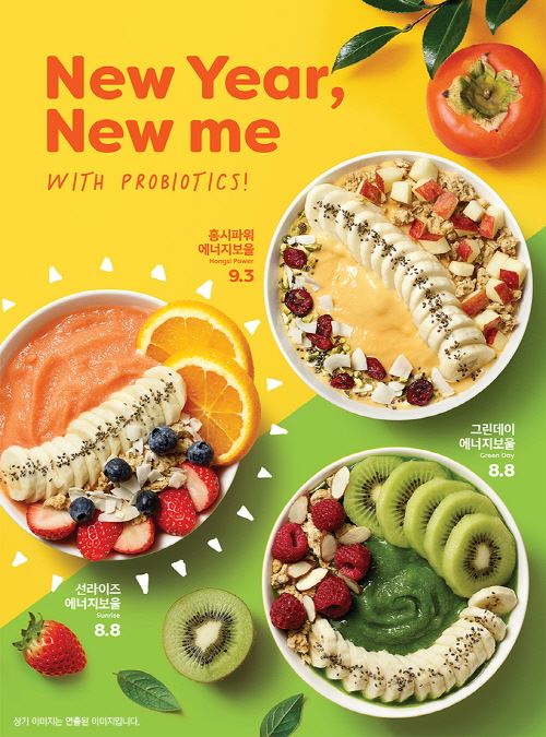 신제품 3종은 ▲오렌지주스에 딸기, 파인애플, 바나나 등을 갈아 넣은 상큼한 맛의 스무디 위에 생 오렌지, 딸기, 코코넛칩 등 토핑을 얹어 새해 일출을 연상시키는 ‘선라이즈 에너지보울(8800원)’ ▲애플주스와 케일, 망고, 바나나 등 과일과 채소를 혼합해 갈아낸 뒤 생 키위, 라즈베리 토핑을 더한 ‘그린데이 에너지보울(8800원)’ ▲홍시와 요거트가 섞인 달콤한 스무디 위에 고소한 치아씨드, 피스타치오, 건크렌베리가 토핑으로 듬뿍 담겨 부드럽고 달콤하게 즐길 수 있는 ‘홍시파워 에너지보울(9300원)’ 등 3종이다.