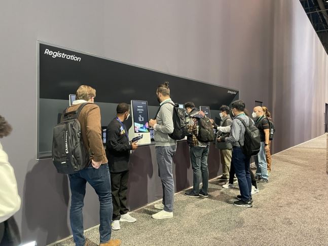 라스베이거스 컨벤션센터 내 삼성전자 부스에 입장하려는 관람객들이 키오스크로 입장 신청을 하고 있다. (사진=연합뉴스)