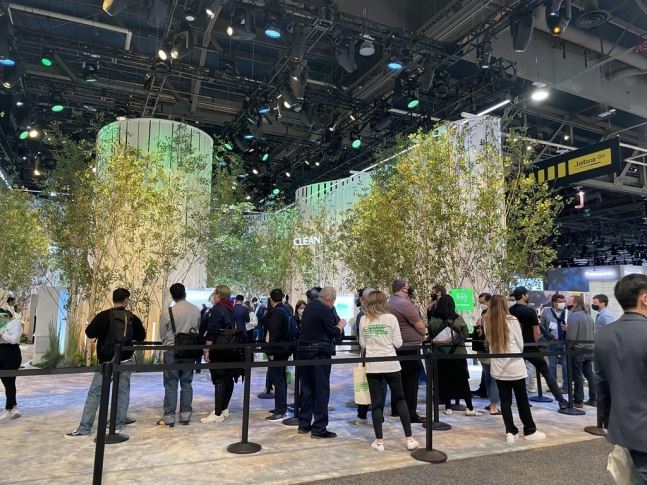SK그룹의 친환경 주제 부스 '그린 포레스트 파빌리온'에 입장하려는 관람객들이 길게 줄을 서고 있다. (사진=연합뉴스)
