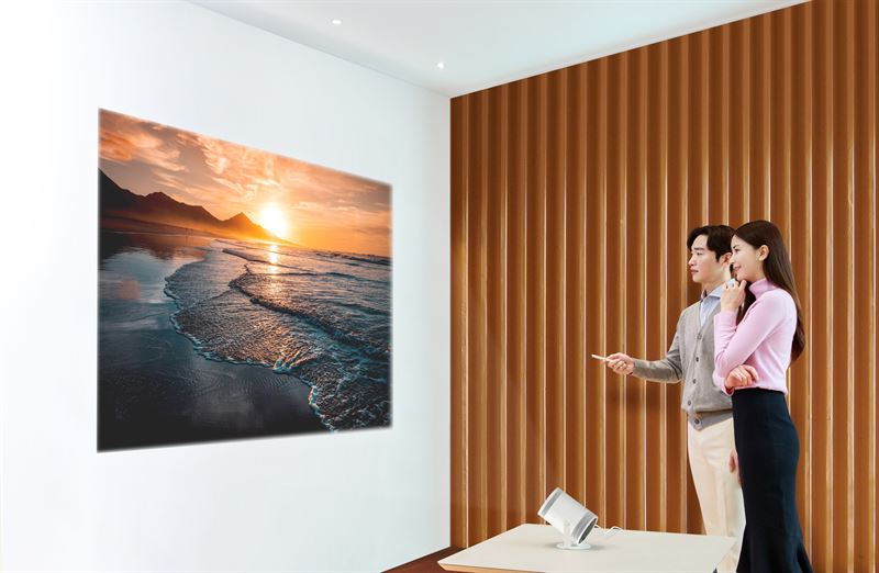 더 프리스타일은 180도까지 자유자재로 회전해 벽·천장·바닥 등 공간에 구애받지 않고 최대 100형(대각선 254cm) 크기의 화면을 구현할 수 있다.