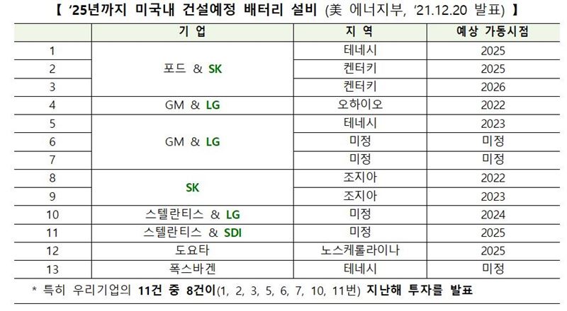 한국전지산업협회에 따르면 국내기업의 배터리 설비는 현재 미국 전체 생산 설비의 10.3%에 불과하다. 2021년 미국에서 가동중인 배터리 생산 설비의 83%를 일본의 파나소닉(테슬라)이 차지하고 있다. 하지만 배터리 3사 발표 계획이 추진되면 2025년까지 70% 수준으로 비중이 확대된다.