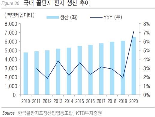 골판지 산업의 개편으로 인해 원지, 판지 부문이 수직계열화 됐다. 반면 영세 판지 업체들은 줄어들고 있다. 결국 업계 상위 업체들이 점유율을 높여하면서 가격 협상력에서 우위를 점하고, 이익률 개선도 기대해 볼 만 하다.