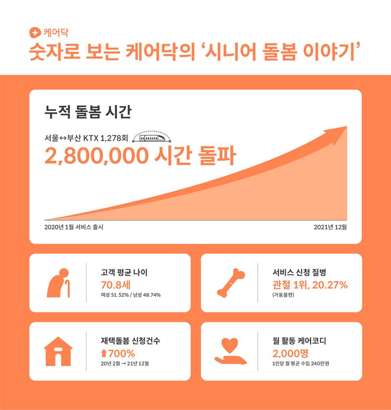 무엇보다 지난 한 해 동안 케어닥이 제공한 돌봄시간만 200만 시간을 훌쩍 넘겨 서비스 시작 2년 만에 고무적인 성과를 이뤄냈다. 이는 하루 평균 6000시간이 넘는 돌봄을 제공한 것을 의미하며 이를 환산하면 서울에서 부산까지 KTX를 타고 왕복(5시간) 1000번 이상을 이동할 수 있는 시간이다.