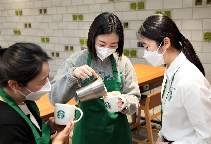 스타벅스 리턴맘 프로그램을 통해 재입사한 리턴맘 파트너들이 음료 실습 교육을 수강하고 있다. (사진=스타벅스코리아)