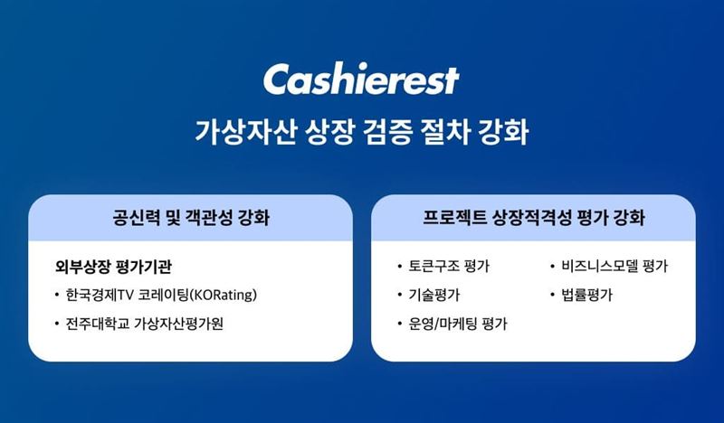앞서 캐셔레스트는 지난 2020년도부터 교수, 변호사 등 가상자산 관련 업계 전문가로 구성된 외부 상장평가위원회를 통해 상장을 희망하는 프로젝트의 토큰 구조, 성장세, 기술 수준, 법률 및 마케팅 구조 등을 평가한 이후 신청 프로젝트의 상장적격성 여부를 최종 심사에 반영해왔다.