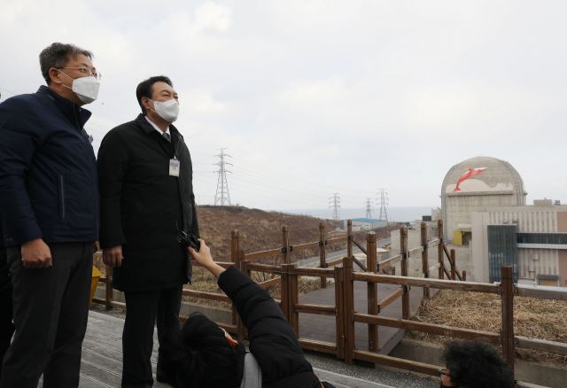 윤석열 대통령 당선인(오른쪽)이 지난해 말 경북 울진군 신한울 3·4호기 건설 중단 현장을 찾아 관계자의 설명을 듣고 있다. (사진=연합뉴스)