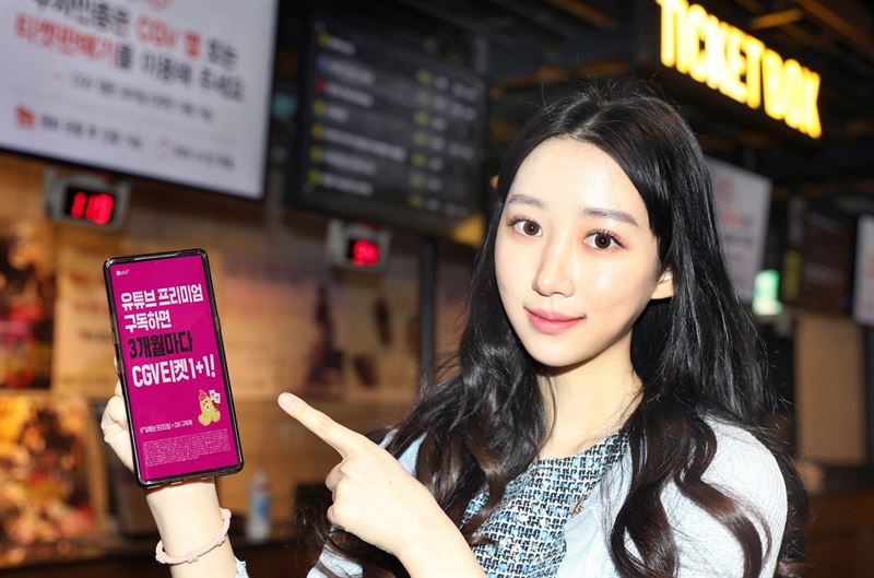 모델이 서울 용구 소재 CGV에서 ‘유튜브 프리미엄+CGV 구독팩’을 소개하고 있다. (사진=LG유플러스)
