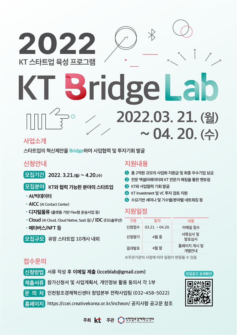 KT Bridge Lab은 스타트업이 사업화 아이디어를 제안하면 KT와 전문 액셀러레이터가 함께 검토하고 사업 협력과 투자 기회를 만들어가는 스타트업 액셀러레이팅 프로그램이다. 창업 생태계 활성화와 환경·사회·지배구조(ESG) 경영실천 차원에서 마련됐다.