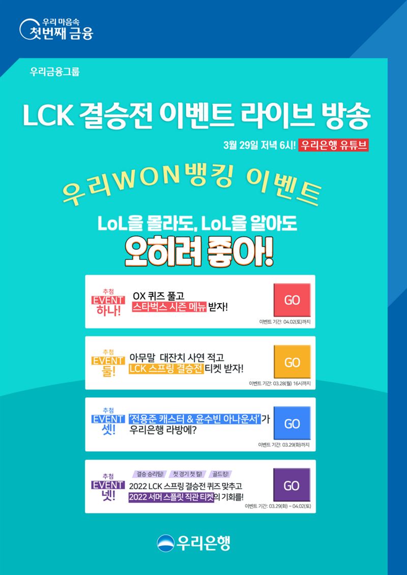 우리은행은 ‘우리은행과 함께하는 2022 LCK 스프링 결승전’에 맞춰 LCK 팬들과의 소통강화와 결승전의 재미를 한층 더하기 위해 ‘LCK 결승전 이벤트 라이브 방송’을 진행하고 ‘롤을 몰라도! 롤은 알아도! 오히려 좋아!’ 이벤트도 함께 실시한다.