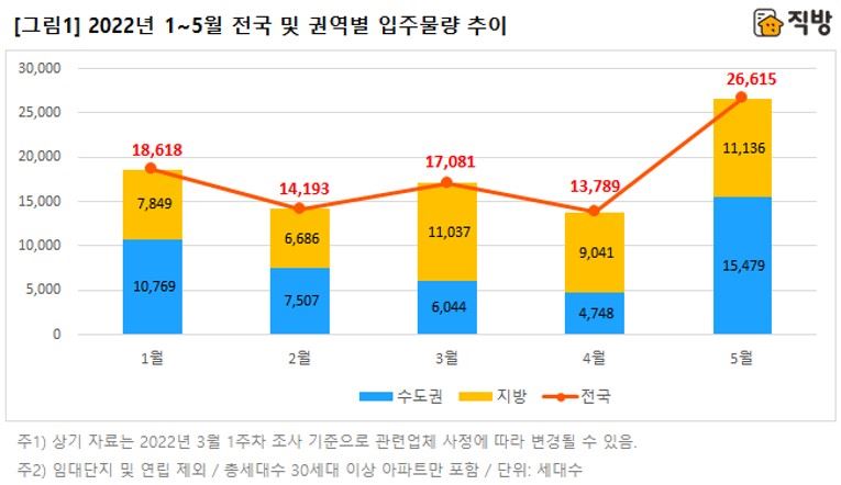 2022년 1~5월 전국 및 권역별 입주물량 추이 (자료=직방)