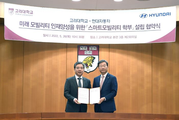 현대차와 고려대는 26일 고려대 서울캠퍼스 본관에서 장재훈 현대차 사장, 정진택 고려대 총장 등이 참석한 가운데 ‘스마트모빌리티 학부’ 설립을 위한 협약식을 가졌다고 밝혔다.