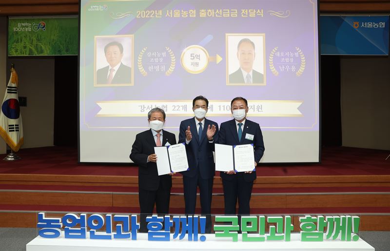 농협중앙회는 지난달 31일 서울시 강동구 서울지역본부 대강당에서 이성희 농협중앙회장, 서울농협 및 산지농협 조합장 등이 참석한 가운데 '2022년 서울농협 출하선급금 전달식'을 개최했다고 1일 밝혔다.