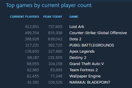 1일 글로벌 PC게임 유통 플랫폼 스팀에 따르면 오후 5시 20분을 기준으로 '로스트아크'의 플레이 유저 수는 61만2851명으로 집계됐다. 이날 최고 유저수는 73만7605명이었다.