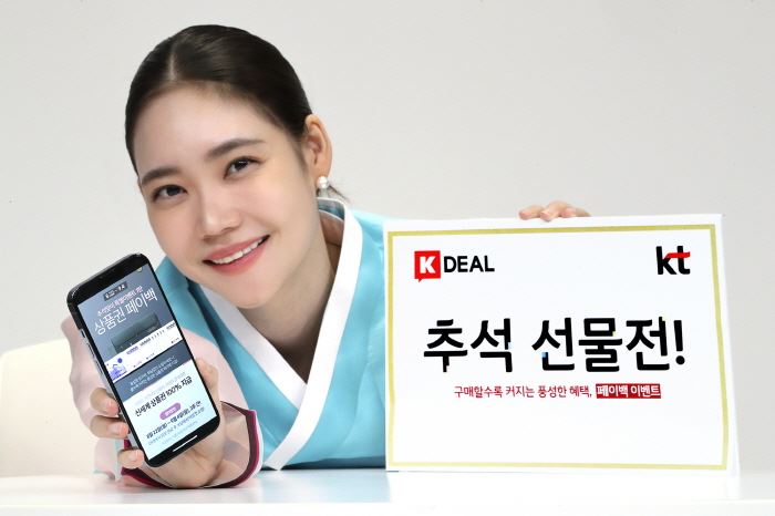 KT가 인공지능(AI) 빅데이터 기반의 문자 커머스 K-Deal(케이딜)을 통해 추석 맞이 초특가 할인과 상품권 페이백 이벤트 등을 마련했다고 24일 밝혔다.