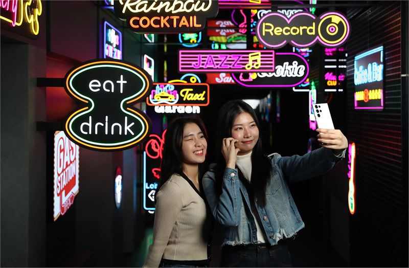 서울 성동구 성수동에 오픈한 갤럭시 스튜디오 성수를 찾은 방문객들이 네온사인으로 도심의 야경처럼 꾸민 공간에서 '갤럭시 S23 울트라' 카메라 기능을 체험하고 있다. (사진=삼성전자)