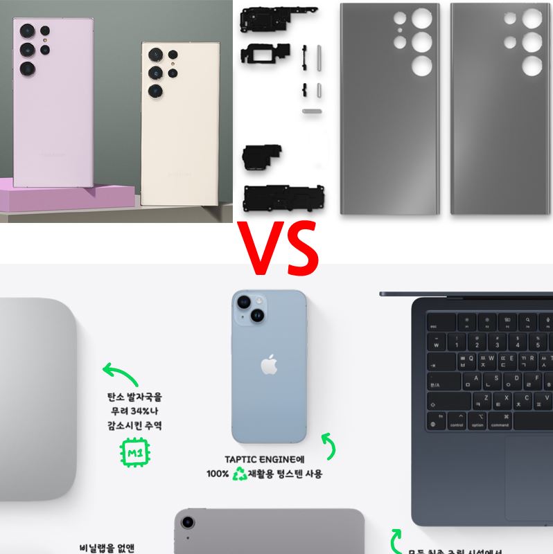 삼성전자가 사전예약에 돌입한 ‘갤럭시 S23’ 시리즈에 폐어망 등 재활용 소재를 대거 탑재했다고 강조한 가운데(상단), 애플의 친환경 부품 및 정책(하단)과 비교되고 있다. (사진=삼성전자, 애플코리아)