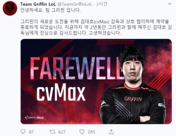 한편 김대호 전 감독은 그리핀에서 감독으로 2년을 보냈으며 롤 챔피언스 코리아 리그에서 3연속 준우승을 달성하는 등 꾸준한 성과를 내왔다. 이같은 성적과 롤드컵이라는 큰 대회를 불과 2주 앞둔 시점에서 내려진 감독 해고 통보에 팬들의 충격은 더해질 것으로 보인다.