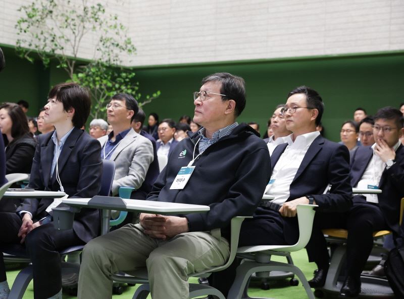 6일 오후 서울 강남구 GS타워에서 열린 제1회 ‘GS데이’에 허태수 회장(가운데)이 참석하여 스타트업 투자자 발표를 경청하고 있다. (사진=GS)