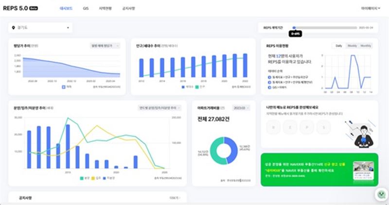 REPS 5.0 BETA는 WEB 기반 전환과 동시에 지도에서 데이터를 확인할 수 있는 GIS 메뉴를 개발해 제공한다. GIS의 주요 메뉴로는 아파트, 오피스텔의 주요 정보와 학군, 인구이동, 개발계획 등이 추가됐다. 이외 통계 메뉴로는 기존 REPS의 주요 메뉴와 함께 미분양관리지역, 초기분양율 등 신규 메뉴를 제공한다. 여기에 모집공고 등을 REPS 솔루션을 통해 쉽게 확인할 수 있도록 모집공고 검색 메뉴도 신설했다.