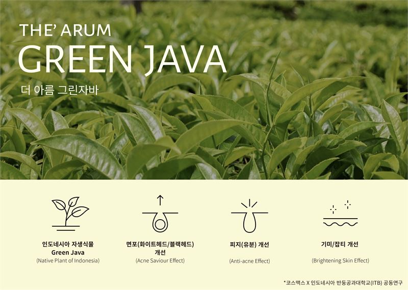 The’Arum의 첫 소재인 ‘그린 자바(Green Java)’는 인도네시아 여성들의 대표적인 피부 고민인 여드름 증상 완화 및 미백에 도움을 주는 성분이다. 그린 자바는 해발고도 800-2000 미터의 경작지에서 재배된 소재로 △사포닌 △플라보노이드 △탄닌 △식물스테롤(plant sterol) 등의 효능 성분을 함유하고 있다.