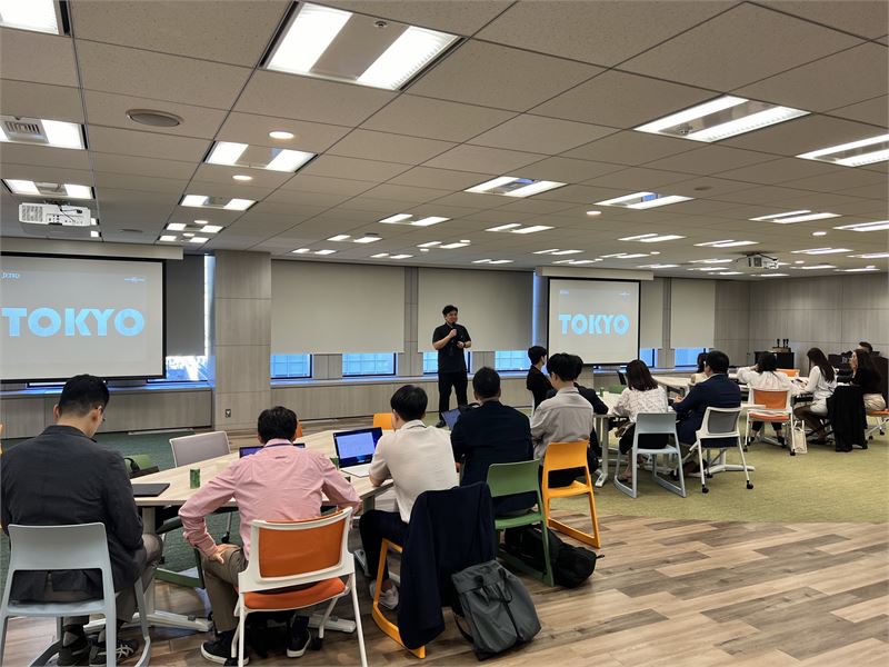 지난 12일 오전 일본 도쿄 JETRO 도쿄본부 이노베이션가든국내 스타트업 참가자들이 JETRO(일본무역진흥기구) 관계자에게 일본 시장 소개 및 지원사항에 대한 설명을 듣고 있다. 사진=롯데지주.