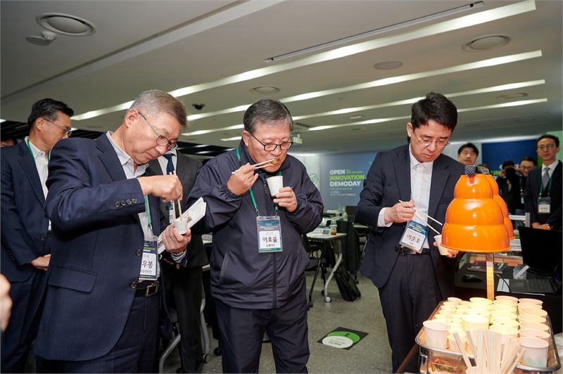 지난 25일 열린 ‘풀무원 오픈이노베이션 성과발표회(Demoday)’ 미니 전시회에서 이효율 풀무원 총괄CEO(가운데)와 이우봉 전략경영원장(왼쪽)이 풀무원 오픈이노베이션 프로그램 참여 스타트업의 대체육 제품을 시식하고 있다.