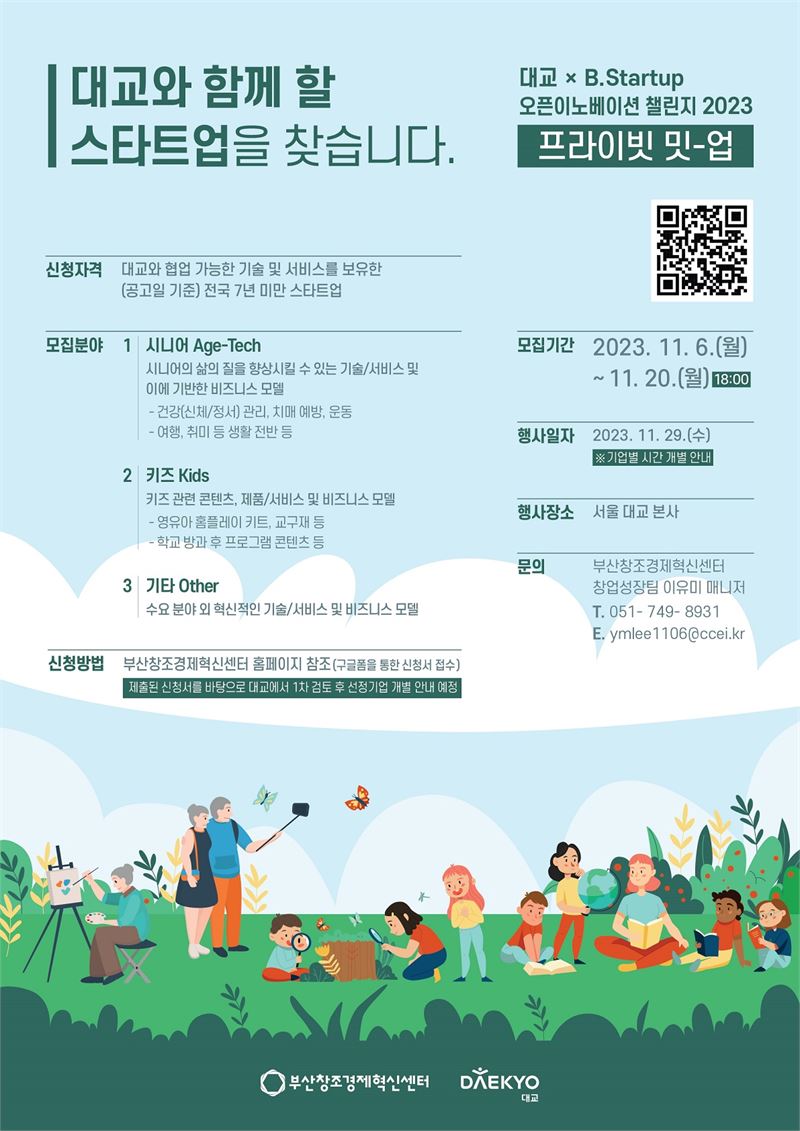 대교 관계자는 “부산창조경제혁신센터와 오픈이노베이션 프로그램을 통해 혁신 기술을 가진 유망 스타트업을 발굴하고 지속가능한 동반성장 발판을 마련하도록 적극 협력할 계획”이라며 “에이지테크(고령친화기술)와 키즈콘텐츠 등 신성장동력 발굴을 함께 도모할 수 있는 다양한 스타트업의 많은 참여와 관심을 바란다”고 말했다.