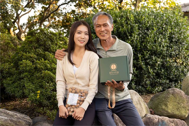 이인지 호두나무숲 대표와 아버지 이희수 씨가 호두나무숲 상품을 들고 있다. 사진=쿠팡.