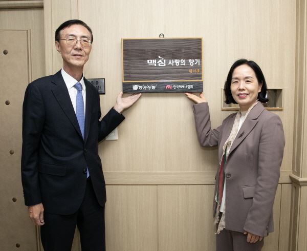 20일 인천광역시 부평구에 위치한 인천상정초등학교에서 진행된 ‘제16회 맥심 사랑의 향기’ 악기 기증식에서 동서식품 최상인 홍보상무(왼쪽)와 인천상정초등학교 이숙경 교장(오른쪽)이 현판과 함께 기념촬영을 하고 있다. 사진=동서식품.