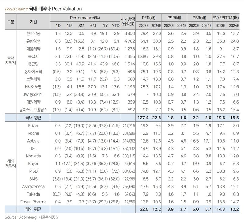 다올투자증권은 "탄탄한 실적과 잠재적인 GLP-1 파이프라인의 확장성을 보유한 한미약품을 업종 내 톱픽으로 제시한다"고 밝혔다. 관심종목으로는 가치 대비 주가가 낮은 동아쏘시오홀딩스와 뇌질환 플랫폼 추가 라이센스 아웃 가능성이 높은 에이비엘바이오를 추천했다.