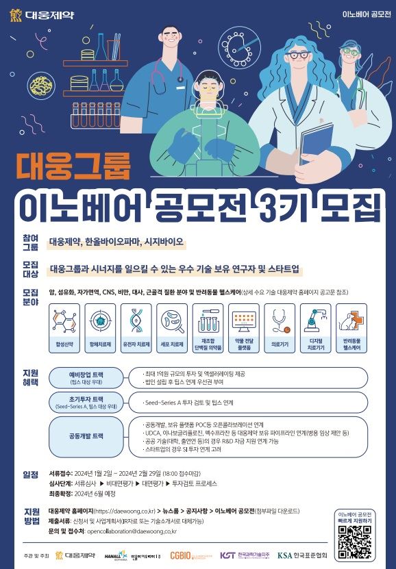 ‘공동개발’의 경우 오픈 콜라보레이션, 대웅제약 파이프라인, R&D 자금 지원, SI투자 등에 대한 연계 검토 기회가 부여될 예정이다. 서류접수는 2월 29일까지 진행되며, 서류심사, 비대면 평가, 대면 발표 평가, 전문가 검증 등 거쳐 최종 심사 결과가 발표된다. 자세한 공모전 정보는 대웅제약 공식 홈페이지에서 확인이 가능하다.