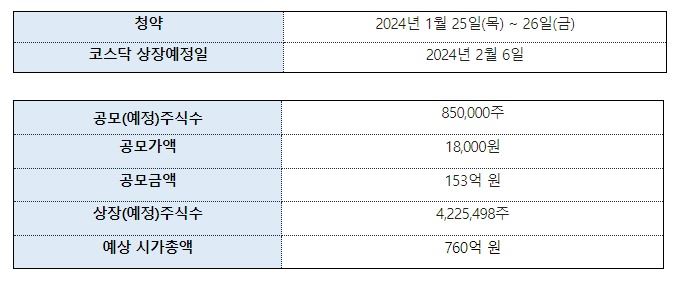 이번 수요예측에는 국내외 1942개 기관이 참여해 총 6억1640만1834주를 신청한 것으로 알려졌다. 단순경쟁률은 966.90대 1로 공모금액은 약 153억원, 상장 후 시가총액은 약 760억원 규모가 될 전망이다. 전체 참여 물량의 99%(가격 미제시 9.5% 포함)가 밴드 상단인 1만6500원 이상의 가격을 제시했고 이 중 약 89%의 기관이 확정 공모가를 초과한 2만원 이상의 가격을 제시했다.