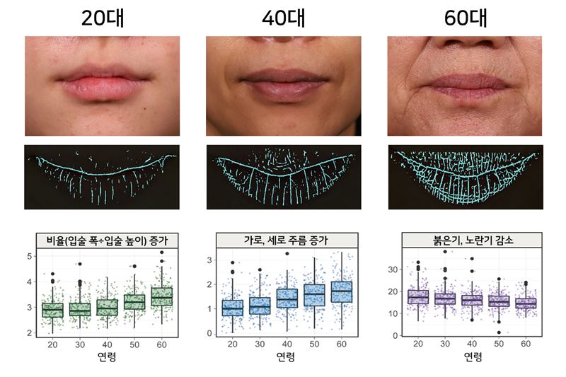 이를 통해 연구팀은 입술노화가 진행될수록 입술의 형태, 표면 주름, 톤이 크게 3가지 특징을 보이면서 변화한다는 사실을 밝혀냈다. 나이가 들수록 입술은 얇고 납작한 형태가 되며 입술 표면의 가로, 세로 주름이 증가하고 붉고 노란 톤이 감소해 생기가 감소했다. 입술 주름이 노화가 진행될수록 세로 주름 비중이 높은 ‘세로형 입술 주름’에서 점점 가로와 세로 주름이 교차하는 ‘격자형(그물 형태) 입술 주름’으로 변화하는 점도 이번 연구로 새롭게 확인했다.