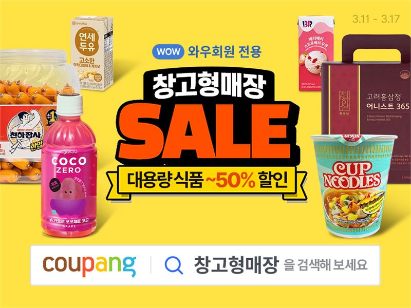 쿠팡은 오는 17일까지 ‘창고형매장’ 프로모션을 진행한다고 14일 밝혔다. 창고형매장은 와우회원 전용 혜택 중 하나로 식품 카테고리 대용량 상품을 합리적인 가격에 구매할 수 있다. 쿠팡은 지속적인 고물가로 인해 가성비 상품을 찾는 와우회원을 위해 인기 푸드 상품을 할인된 가격에 대량으로 구매할 수 있는 ‘창고형매장’ 프로모션을 열었다.