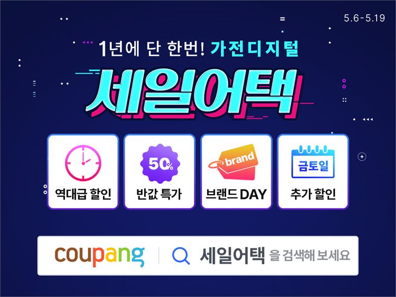 쿠팡이 가전·디지털 카테고리에서 연중 최대 규모 할인 혜택을 선보이는 ‘가전디지털 세일어택’ 기획전을 오는 19일까지 진행한다고 7일 밝혔다. 와우 멤버십 회원들은 최대 70% 할인 혜택을 누릴 수 있다. 가전디지털 세일어택은 쿠팡 가전·디지털 카테고리에서 1년에 단 한번만 진행하는 대규모 할인전으로, 올해 행사에서는 크게 4가지 혜택을 준비했다.