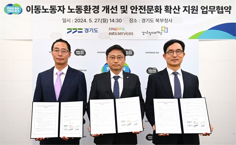 김명규 쿠팡이츠서비스 대표, 오후석 경기도 행정2부지사, 윤덕룡 경기도일자리재단 대표이사가 지난 27일 경기도 북부청사에서 열린 ‘배달파트너 안전환경 및 문화 조성’ 업무협약을 기념하고 있다. 사진=쿠팡.