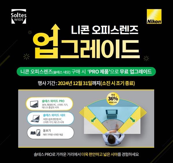 글로벌 안경렌즈 전문 기업 에실로코리아는 니콘 기능성 안경렌즈 '솔테스 와이드 네오' 구매 시 '솔테스 와이드 PRO'로 무료 업그레이드해주는 이벤트를 개최한다고 16일 밝혔다.
