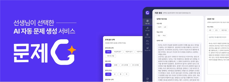 ‘문제G’는 생성형 AI를 기반으로 국어 지문과 문제·문제지를 생성하는 서비스로, 교사들이 직접 보유한 글감을 입력하면 유사 지문을 생성할 수 있으며 다양한 유형 문제를 만들 수 있는 것이 특징이다. 자연어 처리(NLP) 기반 고품질 학습 콘텐츠 자동 생성 시스템을 통해 저작권 문제를 최소화하고 학습자 맞춤형 자료 제공을 통해 교사들 업무 부담을 크게 줄일 것으로 기대된다.