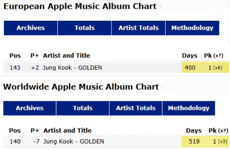 정국이 2023년 11월 발매한 첫 솔로 앨범 'GOLDEN'이 '유러피안(유럽) 애플 뮤직(Apple Music) 앨범' 차트에 400일 동안 진입했다. 또한 '유러피안 '아이튠즈'(iTunes) 앨범' 차트에서도 198일 동안 이름을 올리며 롱런 글로벌 인기를 자랑했다.